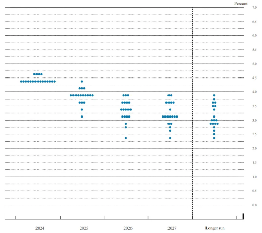 而在当天美联储发布的经济前景预期中,经济增长率被上调,失业率下调,也显示出了美联储的鹰派姿态。从点阵图来看,基于该前景预测,19名联邦公开市场委员会成员中有10人认为,至2025年底联邦基金利率目标区间将降至3.75%到4%之间,考虑到所谓的“更加谨慎”,以25个基点为基础,美联储明年似乎最多只能降息两次,相比9月份的4次预期有较大的回撤。