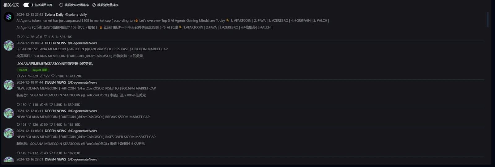从相关推文方面, 12 月 13 日 23: 43 ,Solana Daily 发布了一条关于当前关注度前五的 AI MEME 币,Fartcoin 位列第一。这条推文获得了 52.5 万浏览,随后价格上涨了约 10% ,市值接近 8 亿美元。不过这也算不上是媒体的宣传推动了该代币的上涨。