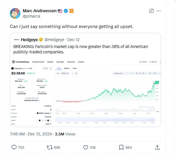 另外,名人效应是否是 Fartcoin 的主要推动?事实上,Fartcoin 在早期几乎没有什么名人提及,直到市值突破 3 亿美元以后,才有一些媒体开始报道。知名风险投资公司a16z的创始人 Marc Andreessen 在 12 月 13 日转发了关于 Fartcoin 的推文,这条推文有着 250 万的观看,但代币的价格却没有因此形成暴涨。