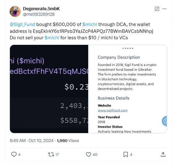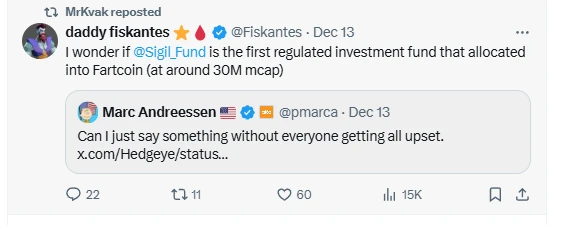 除了地址关联之外,Sigil Fund 创始人 MrKvak 在推特上多次表达对 AI 代币 MEME 币的看好,并且在 12 月 13 日还曾主动转发了一条关于询问 Sigil Fund 是否是持有 3000 万美元 Fartcoin 的推文。