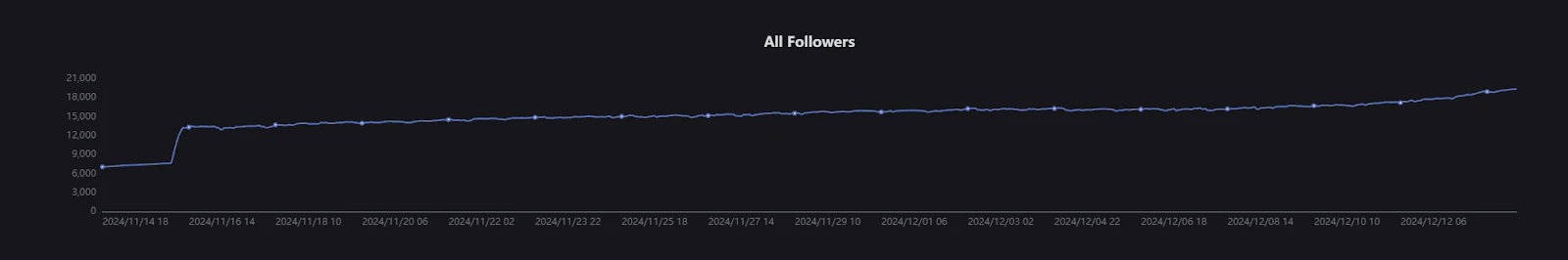 根据 cryptohunt.ai 数据显示,从总关注人数来看,Fartcoin 的官方账号关注人数仅为 2.2 万,而 GOAT 的推特关注人数为 21.4 万。两者差距近 10 倍。其中,Fartcoin 社交媒体数据的主要变化是从 11 月 16 日 3 时到 11 点,推特粉丝量激增一倍,从 7634 个粉丝瞬间变成 13294 个粉丝。这个时间段的价格变化约上涨了 15% ,不算有什么明显激增。而社交媒体上关于该代币的讨论也不多,这个粉丝量的增长存在一定的蹊跷。
