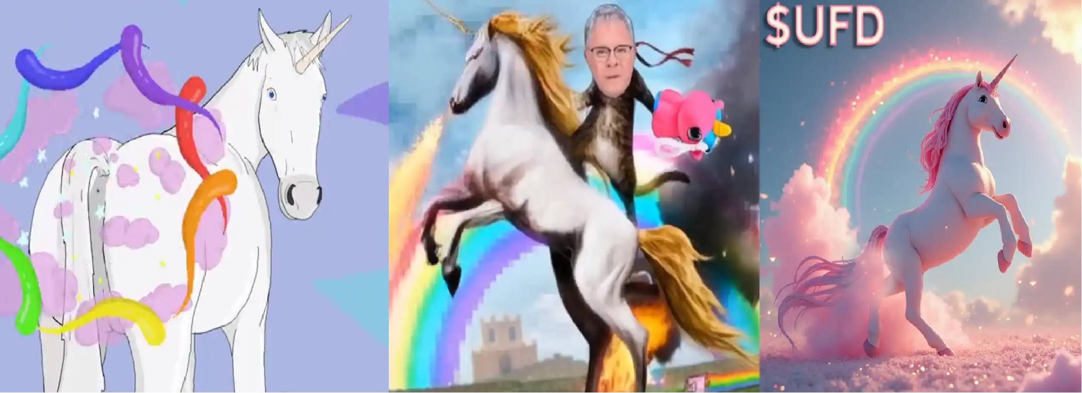 而 UFD 的叙事完美结合了 Fartcoin 的热度,又增添了讽刺意味。一位 54 岁的拥有白银和黄金投资频道的 YouTuber 贵金属投资者在看到 Fartcoin 市值达到 5 亿美元后,决定创建自己的 meme 币 Unicorn Fart Dust「独角兽屁尘」,作为对加密货币的社会实验,以验证加密货币是否是有价值的资产。之所以选择 Unicorn,有网友推测是因为马斯克之前为特斯拉画了一幅「放屁的彩虹独角兽」。