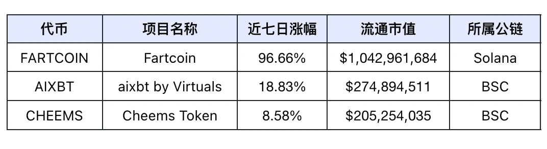 过去一周市场代币涨幅前 5 名(未计入交易量过小的代币和 meme 币),数据来源:Coinmarketcap
