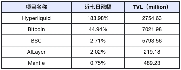 过去一周市场公链 TVL 涨幅前 5 名(未计入 TVL 较小的公链),数据来源:Defilama