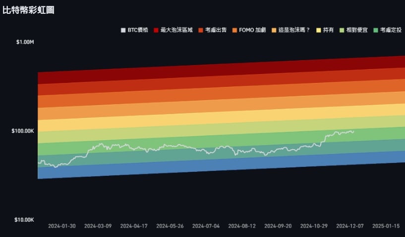 比特币彩虹图 展示 ,比特币当前价格( 9.7 万美元 )位于「 考虑定投 」区间。
