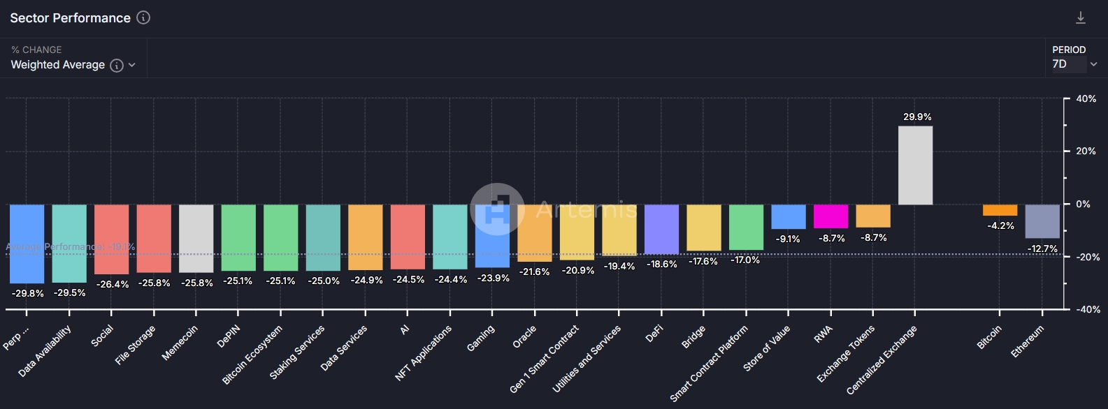 根据 Artemis 数据 显示 ,本周区块链领域板块的平均涨幅为 (-19.1 %), 其中 Centralized Exchange、Exchange Tokens 和 RWA 分别以 (29.9%、-8.7%、-9.1% )占据前三。