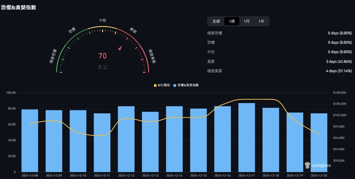 本周的市场情绪 指标 由 80 (极度贪婪)下降至 74 (贪婪),整周在(极度贪婪)与(贪婪)的区间。