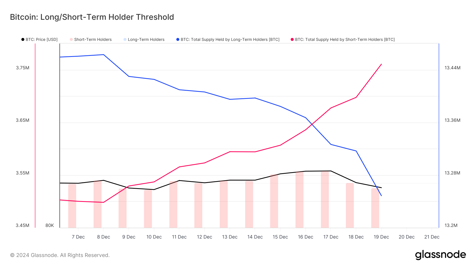 根据链上 数据 ,本周比特币的长短期持有者数据显示,随著价格上涨,短期持有者(红缐)持仓量显著增加,而长期持有者(蓝缐)持仓量则持续减少,特别是在 12 月初比特币价格多次试探十万美金大关时。