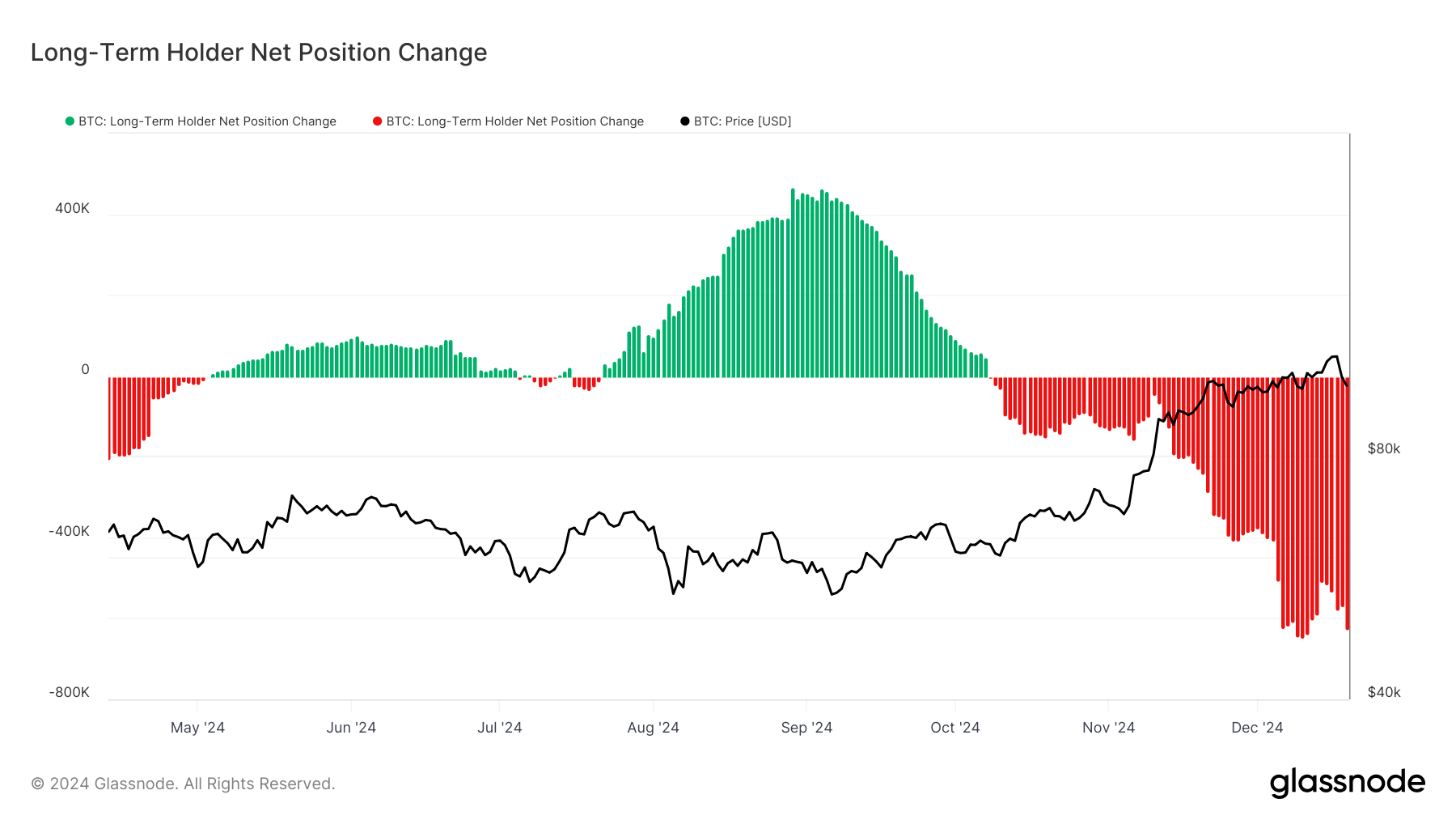 根据链上 数据 ,比特币的长期持有者净持仓量近期出现显著下降,红色条形图显示出自 10 月以来抛售压力逐步加大。尤其是在比特币价格突破新高并接近十万美金时,长期持有者的净仓位变化由正转负,表明部分投资者选择在高位进行获利了结。