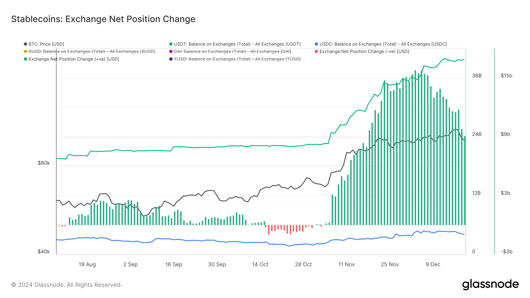 数据 显示 ,本周交易所资产呈现净流入趋势,尤以美国大选后 USDT 的大量流入为主。此现象可能是投资者为即将到来的市场波动做準备,资金流入交易所可能意味著短期内的购𧹒需求提升。