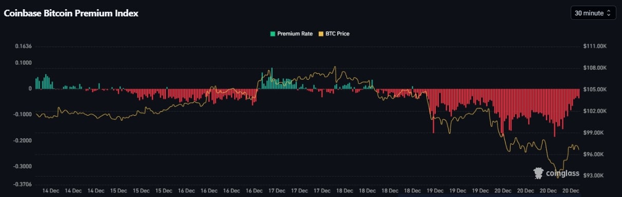多数时间为负,显示美国市场需求相对疲弱,但在部分阶段出现正溢价,表明特定价格区间内仍有资金进场支撑。负溢价期间比特币价格出现大幅回调,暗示美国投资者对市场下行更为敏感,需求疲软进一步加剧价格压力。