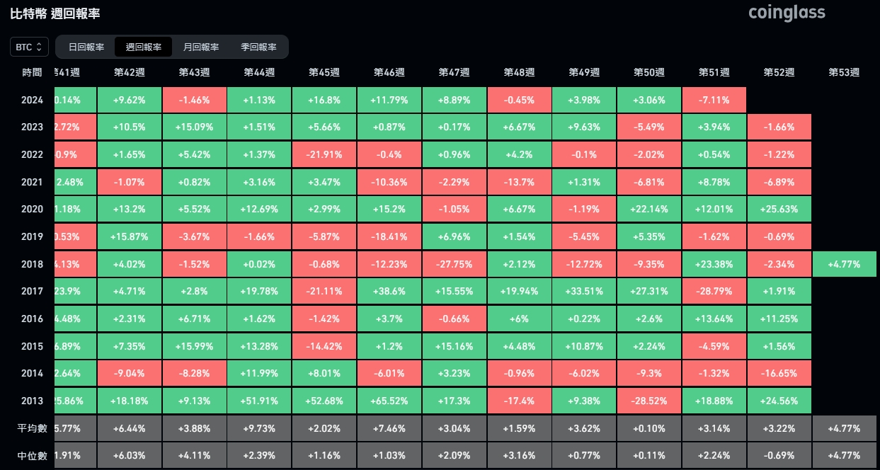 根据历史 数据 第 51 周,比特币的回报率为 -7.11% 。这一表现低于历史周平均回报率( +3.14% )和中位数( +2.24% ),且与前一周第 50 周的回报( +3.06% )有所差异。