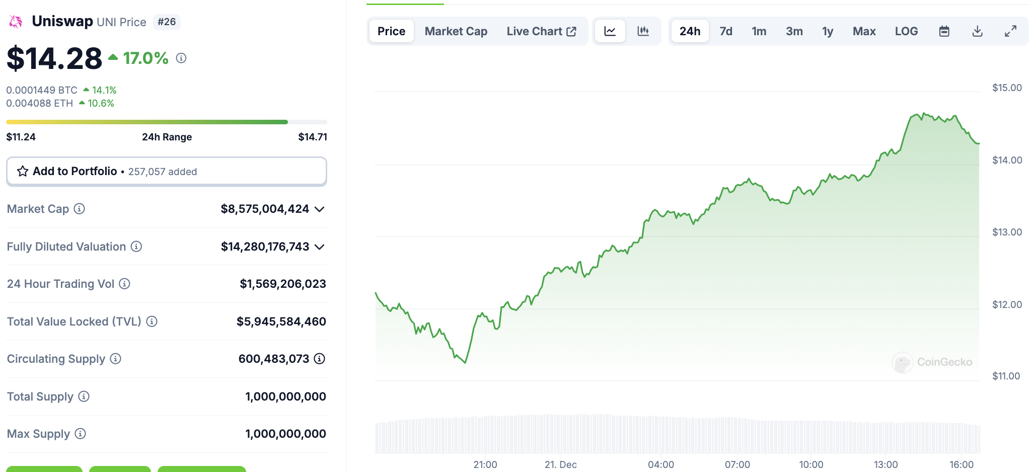 或受此消息以及加密市场回暖的双重影响,UNI 代币价格表现亮眼。CoinGecko 数据 显示 ,UNI 在过去 24 小时内强弹 17%,一度飙升至 14.71 美元,目前稍有回落至 14.28 美元,跻身前 30 大币种中表现最为亮眼的前五名。