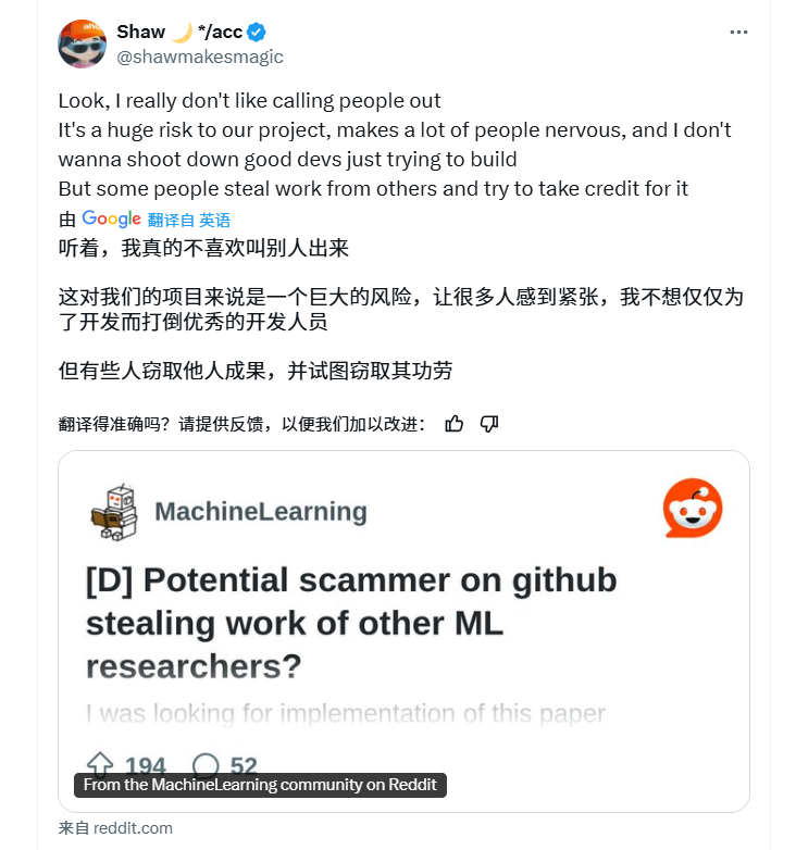 在 $swarms 代币爆火当天,$ai16z 的创始人 Shaw @shawmakesmagic 在推特公开 diss Swarms 框架的开发者 @KyeGomezB ,称“我真的不喜欢公开指出别人的问题。这样做对我们的项目是个巨大的风险,会让很多人感到紧张,而且我也不想打击那些努力工作的开发者。但有些人会窃取别人的工作成果,还试图把功劳占为己有。”并引用了一篇 23 年的 Reddit 帖子 来论证 Kye 的抄袭行为。文章中指出一个 Github repo 可能存在窃取他人成果的痕迹,而该 repo 属于 Swarms 开发者 Kye。