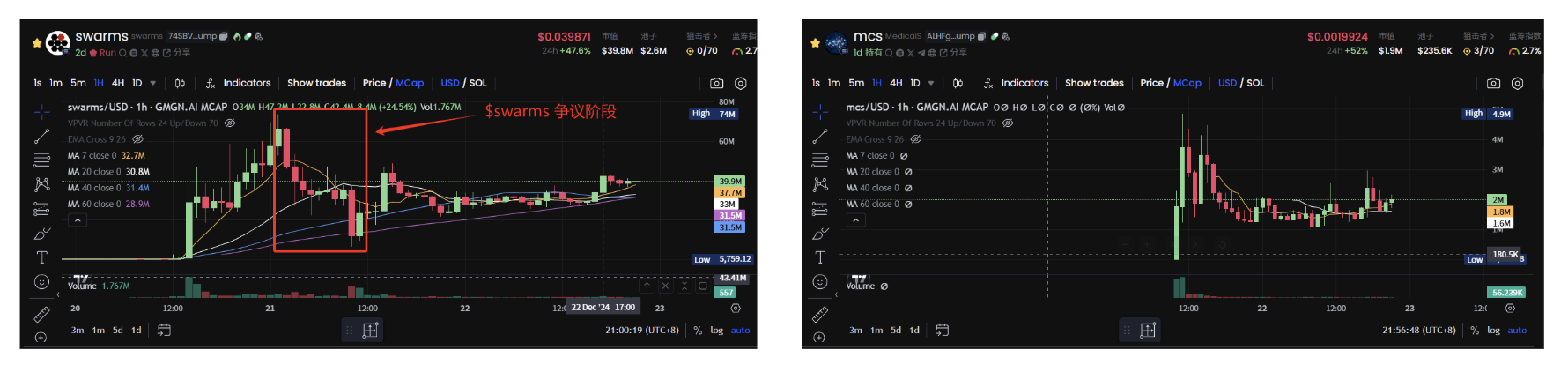 可能是 Kye 对 AI Meme 的玩法尚不熟悉,在 $swarms 共识尚未稳固,币价仍处于下跌趋势之时,发新币这一骚操作直接被许多不明所以的玩家认定为 $swarms 的 Dev 不要这个盘子了, $swarms 不值得再玩。所以 $mcs 的发射在一开始并没有起到拯救 $swarms 的作用,反而让 $swarms 跌得更深,市值从 7400 万美元的高点一度跌至 600 万美元,连带新币 $mcs 一起暴跌。