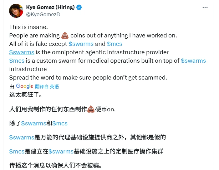 Shaw 的 fud 也让 $swarms 币价接近腰斩。然而面对这一 fud,Swarms 的创始人 Kye 也是不服气,在推特回击的同时发了个基于 Swarms 框架的应用 Medicalswarm 的新代币 $mcs 意图证明自己的框架并非无用,而是真的“有点东西”。