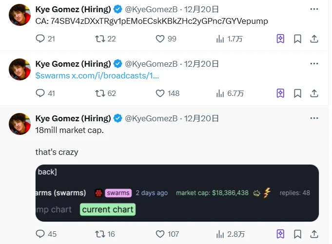 除了 Swarms 官网首页上的明牌代币地址,Swarms 框架的开发者 @KyeGomezB 也在当天持续讨论关于代币的消息。