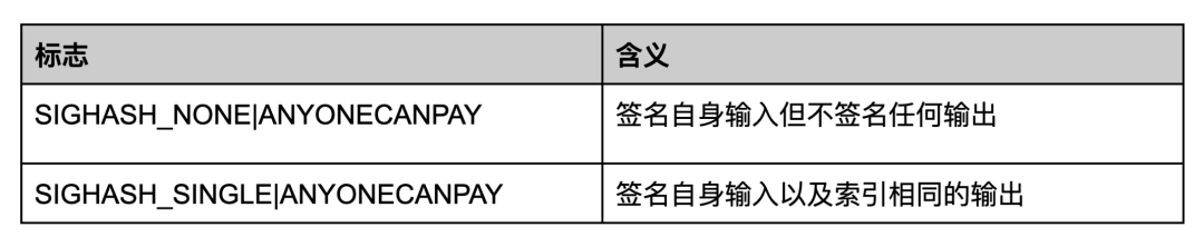 SIGHASH_ANYONECANPAY (0x80): 修改上述标志,使其仅对当前输入签名;允许添加其他输入。
