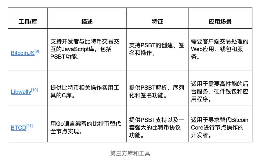 多种工具和库支持PSBT的创建、操作和签名,促进了其在不同平台上的应用。