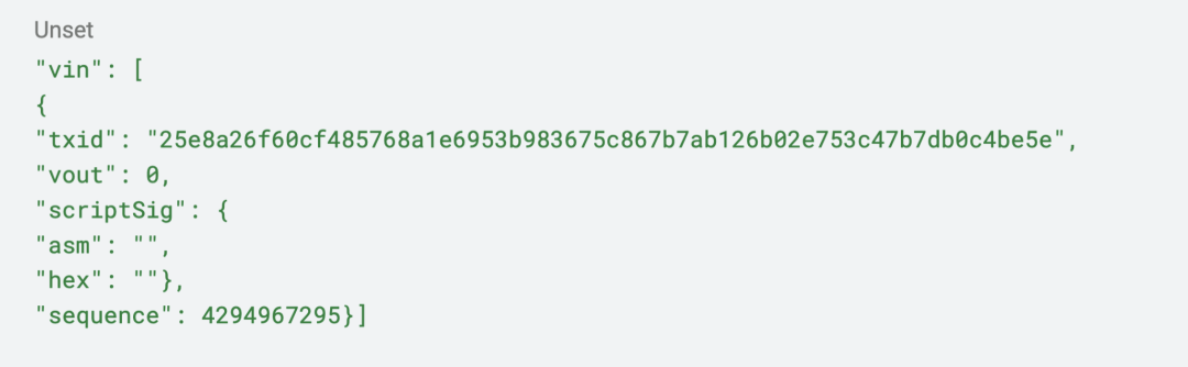 前一个交易哈希和索引: 每个输入引用了一个特定的UTXO,该UTXO通过txid(前一个交易的哈希)和vout(在引用交易中的输出索引)来标识。