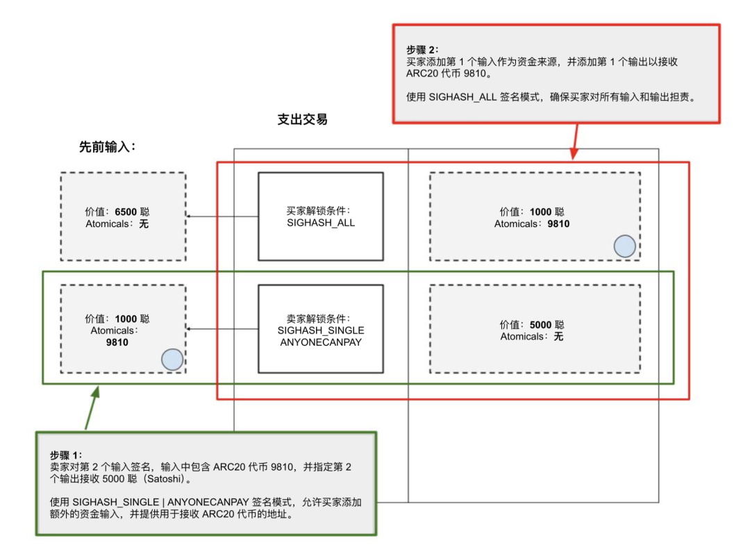 在这种情况下,卖家的挂单应使用 SIGHASH_SINGLE|ANYONECANPAY [17] 进行签名,以确保交易安全。