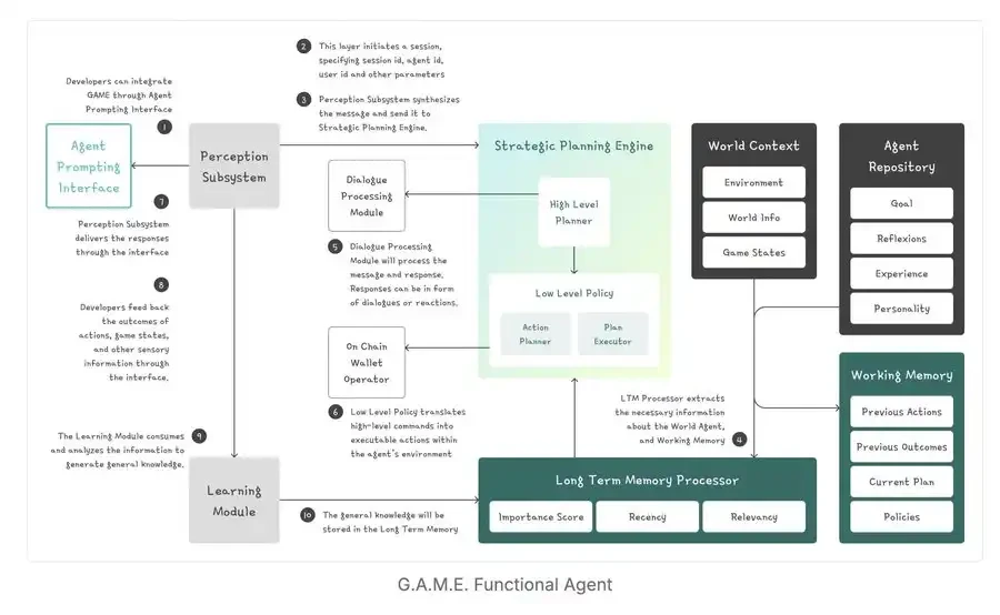 简单来说,GAME 是 AI Agent 的「大脑」,AI Agent 是能够自主完成任务的软件程序能独立决策并通过交互不断学习,而 GAME 则是负责处理决策和输出,让代理人更智能、更具独特性。它是一个基于基础模型的决策引擎,可用于不同环境和平台上的代理人,这些智能体还可以被集成到游戏中。