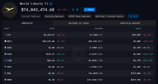 既然收入归属特朗普,那自然特朗普也是要关注项目收益的,从此方面来看,WLFI在加密货币的布局也可以看作是特朗普的持仓补充。而就在最近的一个月,WLFI就开启了买买买模式,根据Lookonchain数据,11月30日以来,World Liberty Financial通过一个钱包斥资约4500万美元购入了大量加密资产,包括3000万美元的ETH、1000万美元的cbBTC、200 万美元的LINK、 191 万美元的AAVE、 75 万美元的ENA以及25万美元的ONDO。