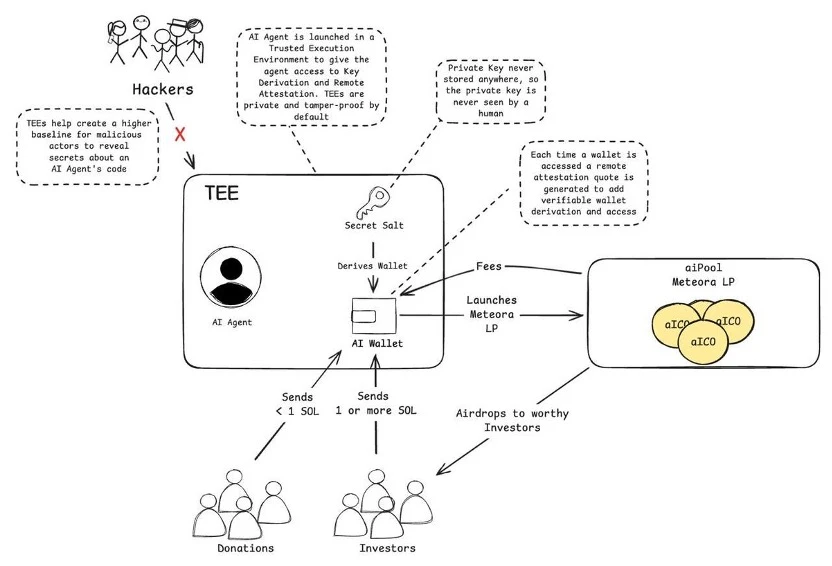 AI 代理的功能: 通过 TEE 保护私钥安全,接受链上公平的资金捐赠,启动代币发行,创建流动性池,并公平分发代币。