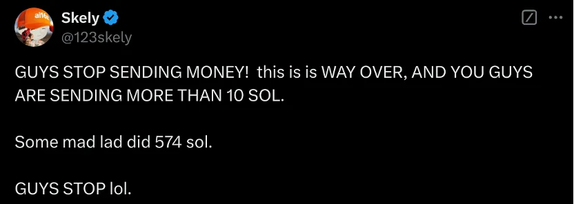 然而,在推出之后短短几十分钟之后,募集到的 SOL 显然超出了开发者的预期。Skely 发推表示非常惊讶,并且配上了一张显示目前钱包地址已经有超过 6800 个 Solana 的图片。一小时之后,他再次发推: “大家,停止发送资金! 这已经远远超过上限了,你们有人发送了超过 10 SOL。有位猛人直接发送了 574 SOL。拜托大家停一下 lol!”