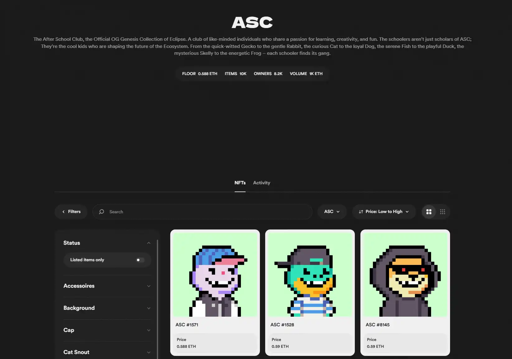 这个链一句话总结就是「以太坊上的 Solana」,官方 NFT 系列叫 ASC( @asclubnft ),现在已经涨到约 0.6 ETH 的地板了。