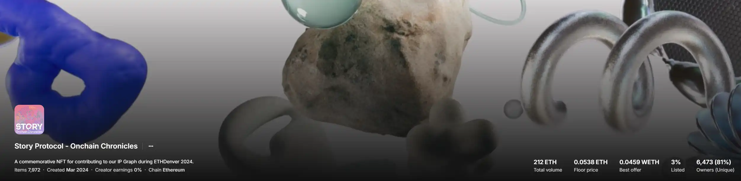Story Protocol 的融资背景非常强,有 $PENGU、$VANA 这些 NFT 能够带来丰厚代币空投的案例在前,Story Protocol - Onchain Chronicles 这个 NFT 系列被视为了潜在获取 Story Protocol 代币空投的凭证,过去半个月已经上涨了 5 倍,目前的地板价大约为 0.05 ETH。