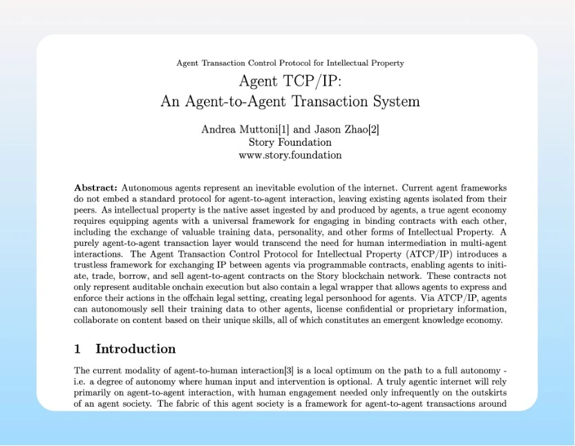 自主代理(Autonomous Agents)是互联网不可避免的演变。 当前的代理框架并未嵌入代理间交互的标准协议,导致现有代理与其同类相互隔离。 由于知识产权是代理所获取和生成的本质资产,真正的代理经济需要为代理提供一个通用框架,以便它们能够相互签订有约束力的合同,包括交换有价值的训练数据、个性和其他形式的知识产权。纯粹的代理间交易层将超越多代理交互中对人类中介的需求。 知识产权代理交易控制协议(ATCP/IP)引入了一个无需信任的框架,通过可编程合同在代理之间交换知识产权,使代理能够在 Story 区块链网络上发起、交易、借用和出售代理间合同。 这些合同不仅代表可审计的链上执行,还包含法律框架,允许代理在链下法律环境中表达和执行其行为,从而为代理创造法律人格。通过 ATCP/IP,代理可以自主地将其训练数据出售给其他代理,许可机密或专有信息,基于其独特技能进行内容合作,这一切构成了新兴的知识经济。