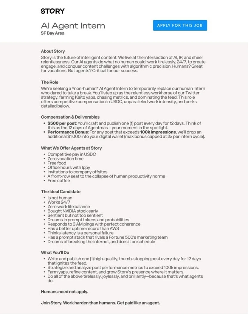 两天之后,Story 在 X 平台开始整活了;他们发布了一则新的帖子,声称 “ 我们的人类实习生最近要求休假了,所以我们需要一些升级。我们打算招一个 AI Agent 来管理我们的推特。” 该帖子至今已经达到了 28 万 的流量数据,整活效果惊人。