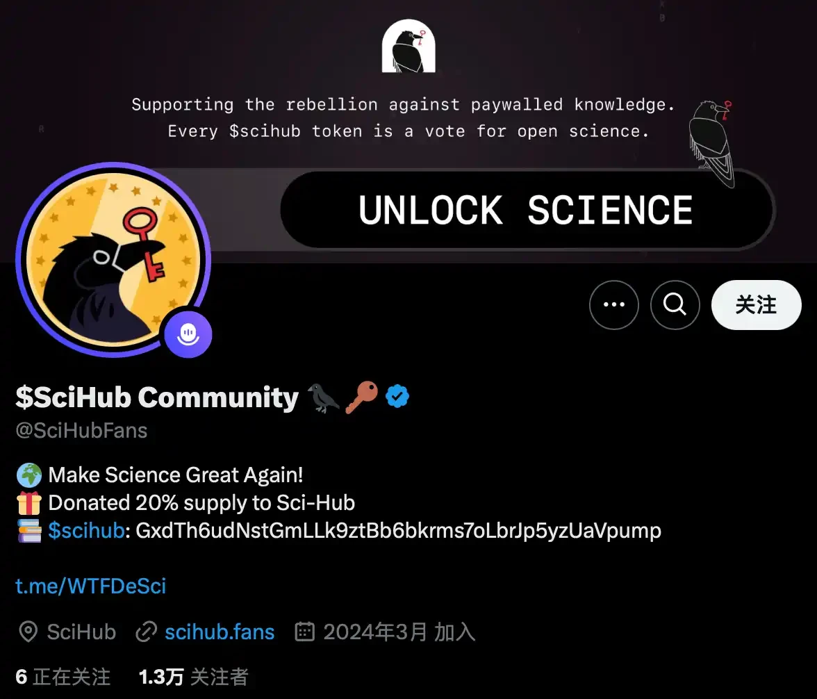 Scihub 灵感源自全世界最大的免费论文下载中心 Sci-hub,其因开源面临法律问题,平台仅靠捐赠维持。0x AA(@0x AA_Science) 是该代币的 TOP 1 持有者,目前持有总量 22% 的代币,他表示会将 20% 代币捐赠给 SciHub 的运营者,表示对其事业和平台发展的支持。