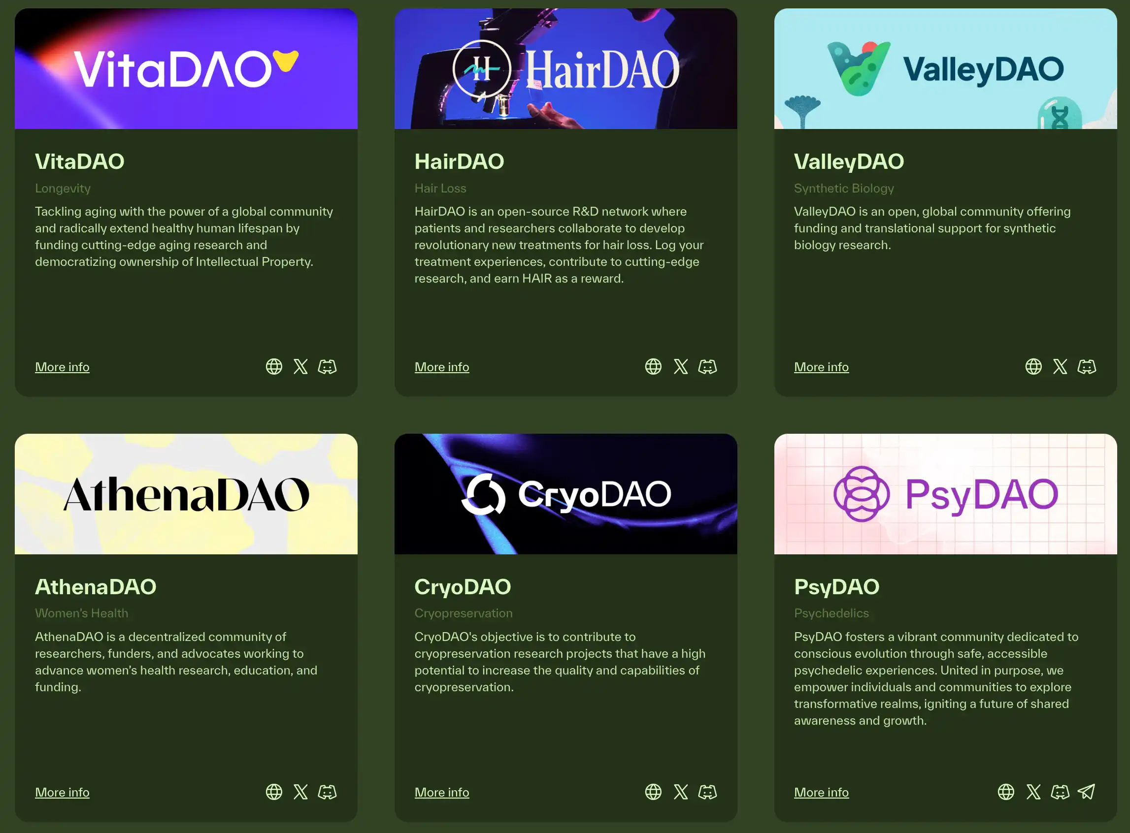 VitaDAO:在长寿科学领域获得 500 多万美元的资金,是辉瑞风投部门和 Balaji Srinivasan 支持的 DeSci 去中心化科学组织,与纽卡斯尔大学合作。值得注意的是,VitaDAO 是「元老中的元老」,是 DeSci 鼻祖、BIO 协议之母 Molecule 的首个 DeSci DAO,专注于长寿领域的研究。当前的 BIO Protocol 协会也是由 VitaDAO 主要成员创立的一家瑞士非营利组织。