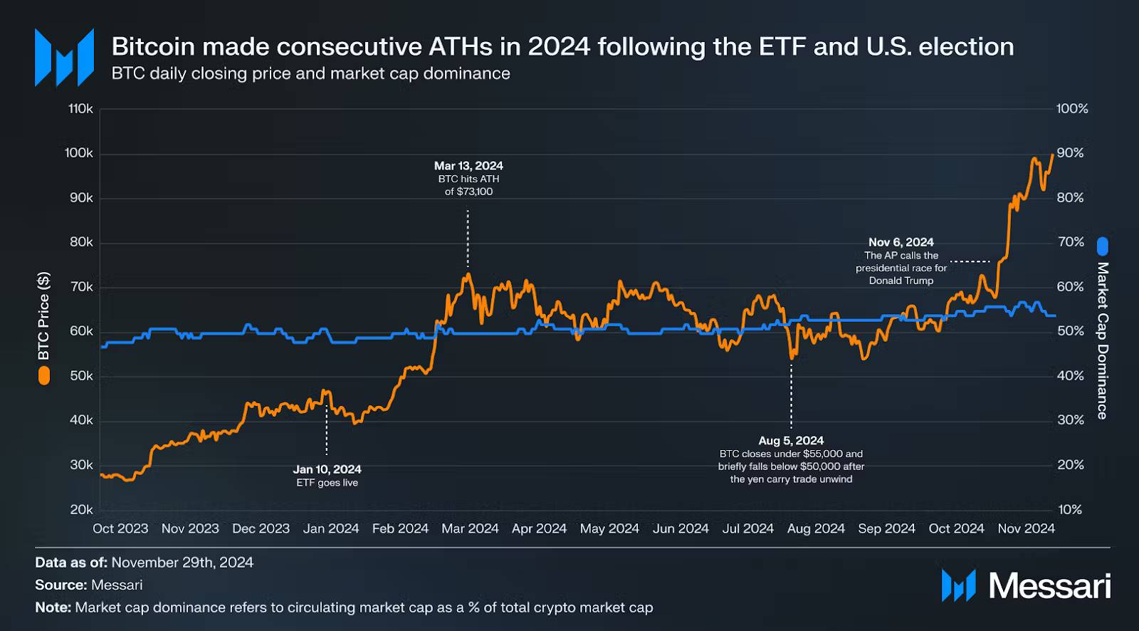- 从 4 万美元起步,ETF 获批后在 Q1 创下 7.5 万美元新高,Trump 胜选后突破 10 万美元重要关口;