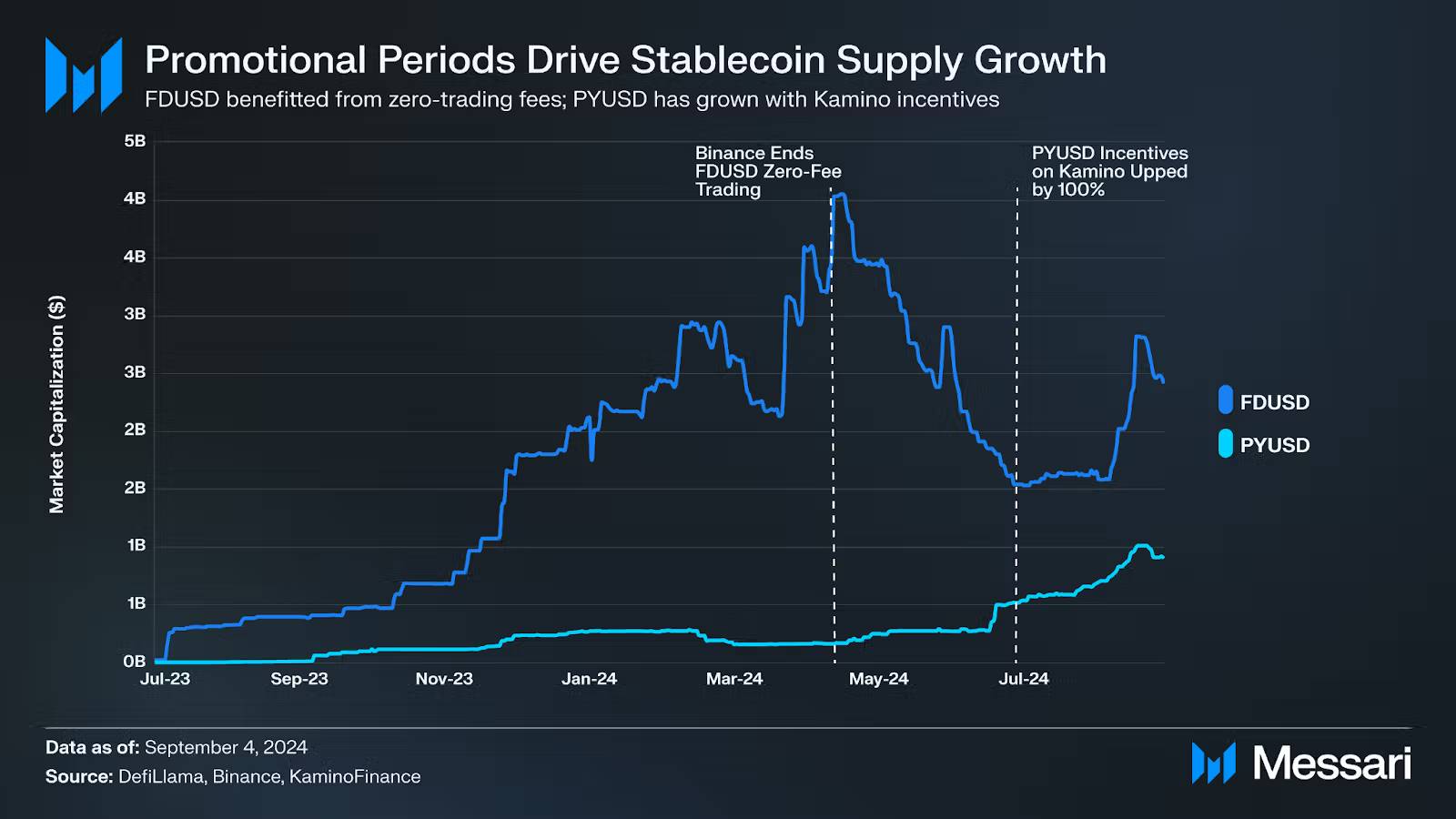 - PayPal 在 5 月份在 Solana 上发行了其稳定币 PYUSD,由 Nick Van Eck 支持的 Agora 也在多个链上推出了稳定币 AUSD,该资产由 Van Eck(资产管理公司)支持并由 State Street 托管;