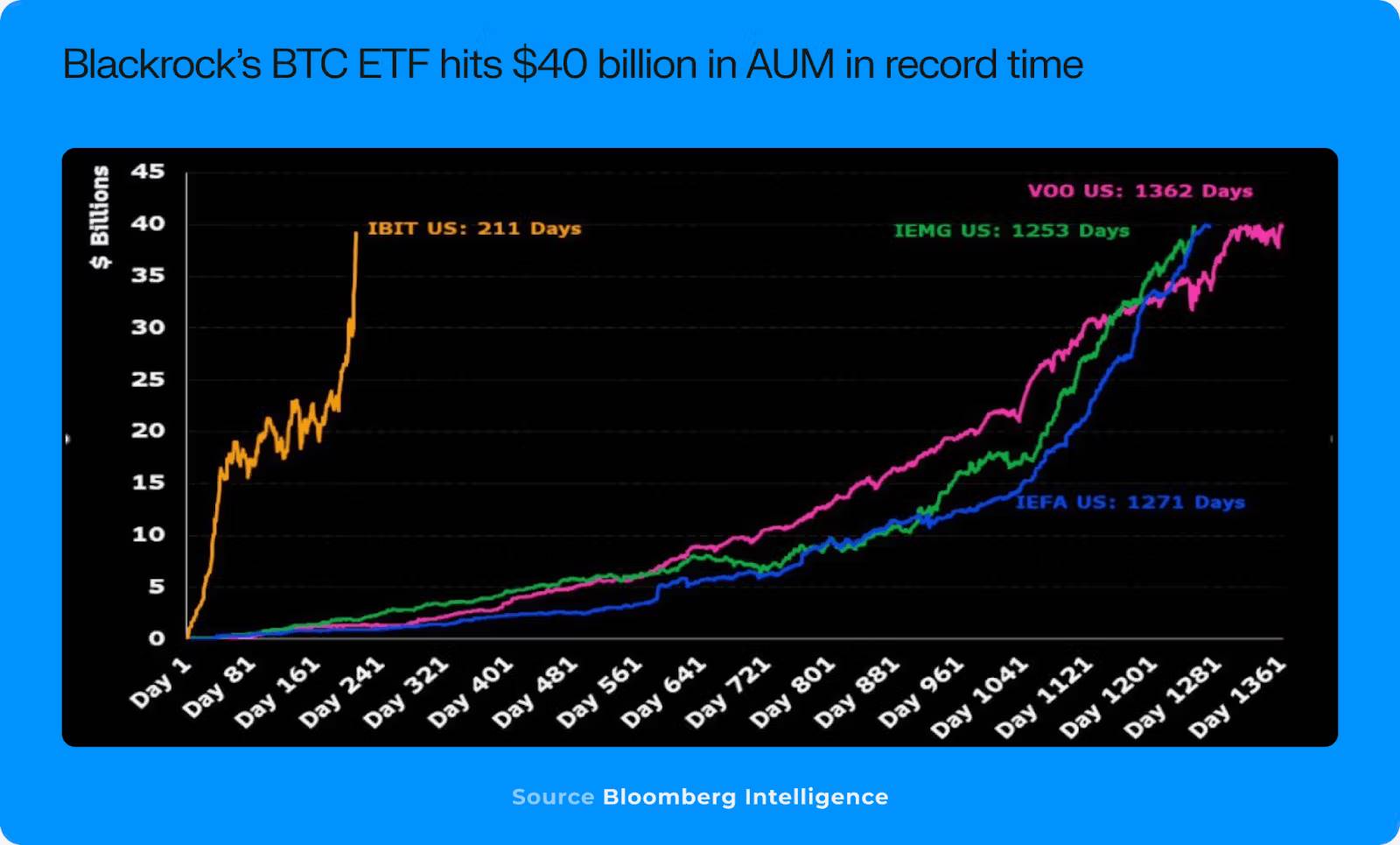 - BlackRock 的 IBIT 创造记录:首个在发行 30 天内达到 30 亿美元 AUM 的 ETF,并在约 200 天内突破 400 亿美元。显示出机构对加密衍生品的强烈需求;