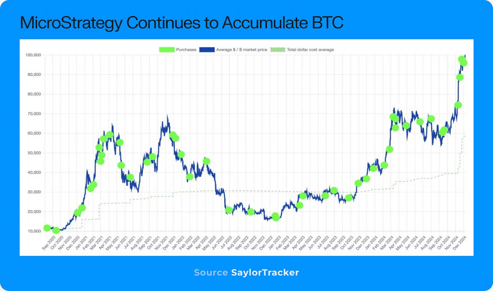 - MicroStrategy 继续大规模购入,最新一次在 12 月 2 日至 8 日期间购入 21 亿美元比特币,前持有约 42 万枚比特币,仅次于 Binance、中本聪和 ETF 发行方;
