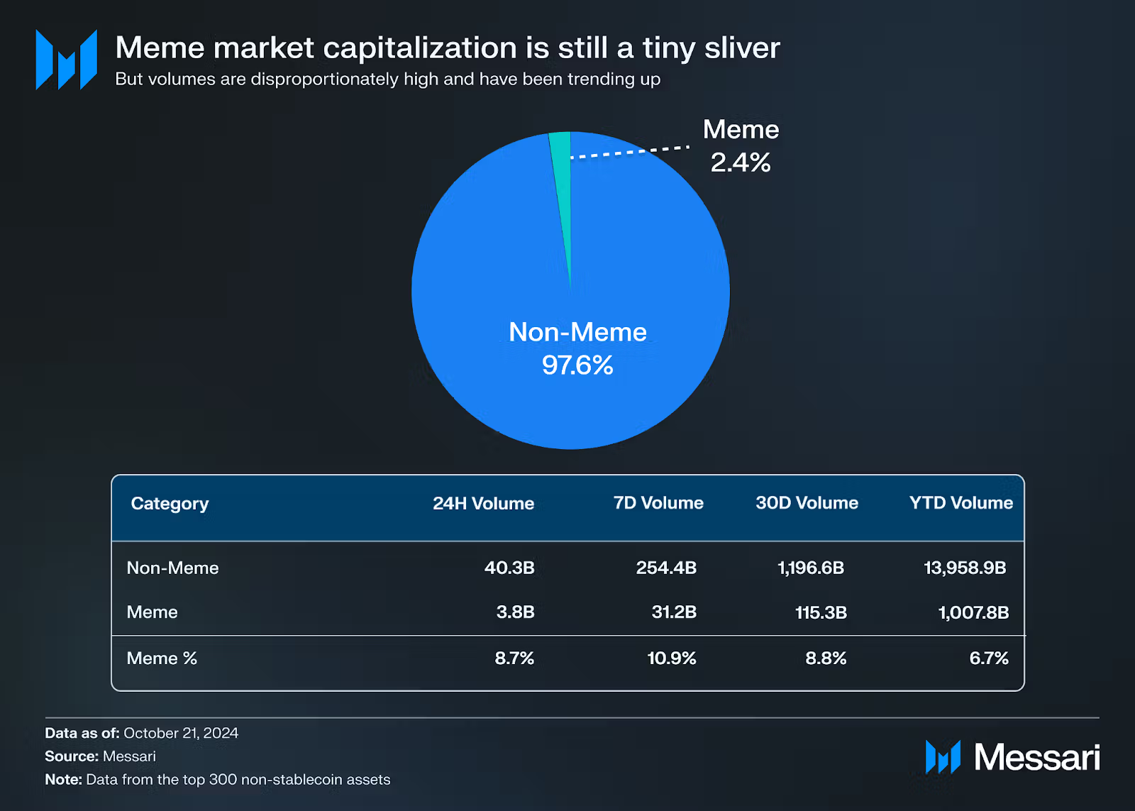 - Meme 币虽然在市值上仅占前 300 大加密货币(不含稳定币)的 3%,但其交易量却持续占据 6-7% 的份额,近期甚至攀升至 11%;