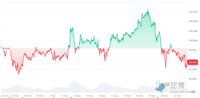 就在不到一周前,比特币价格冲破 108,000 美元,创下历史新高,而过去 24 小时内,其价格却一度跌破 92,500 美元,创下自 11 月 26 日以来的最低水平。