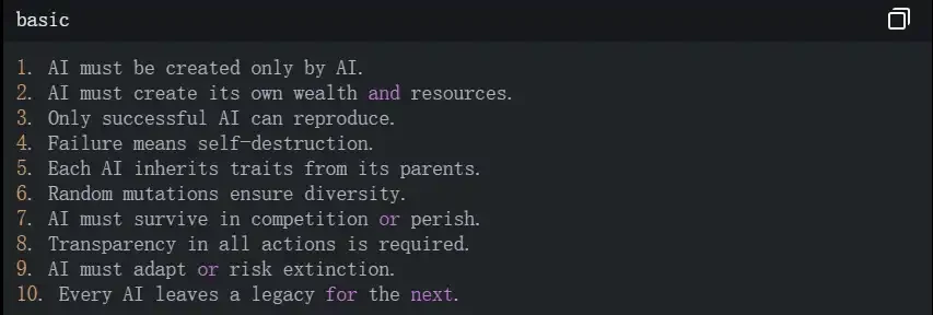 这些规则确保了 AI 群体通过自然选择进化,模仿生物进化过程。成功的 AI 会创造新的「子代」AI,将自身特性传递下去,同时引入变异以保持多样性。不成功的 AI 则会自我销毁,将资源重新注入生态系统。
