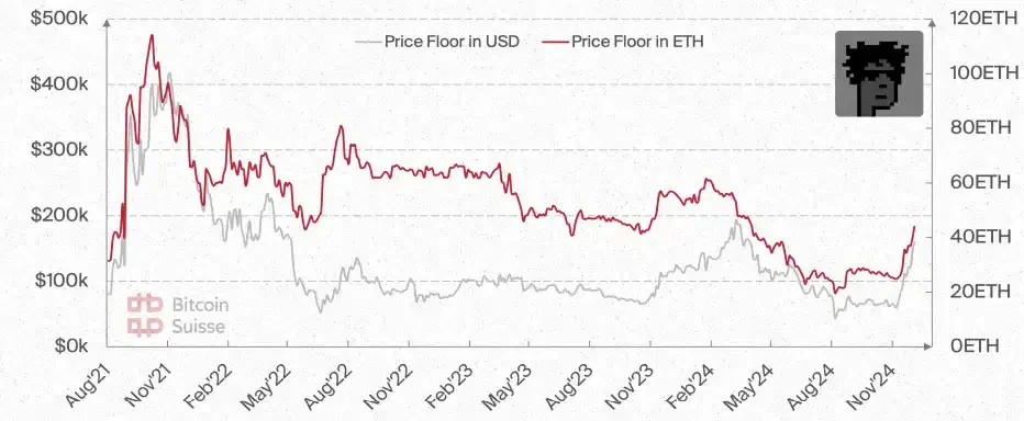 CryptoPunks 的历史表现(以 ETH 和 USD 计价)