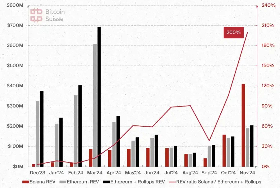 2024 年,Solana 在实际经济价值(REV:交易费用 + MEV 提示)和创始人、投资者及用户的认可度方面,成为以太坊的强劲竞争对手。我们预计,随着基础改进的持续推进,Solana 将在 2025 年继续在竞争激烈的环境中占据优势。