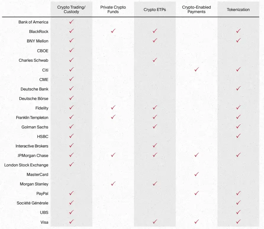 机构正在以前所未有的速度进入加密行业。Stripe 以收购区块链支付公司 Bridge 的方式完成了有史以来最大的一笔收购;BlackRock 迅速取代 Grayscale,成为管理资产规模(AUM)最大的加密基金。22 家主要全球金融机构中已有 13 家开始研究代币化市场,这一市场预计到 2030 年将达到 16 万亿美元。比特币 ETF 的采用速度创历史纪录,Swift 也启动了代币化基金结算的试点项目,行业内的其他重要发展不胜枚举。