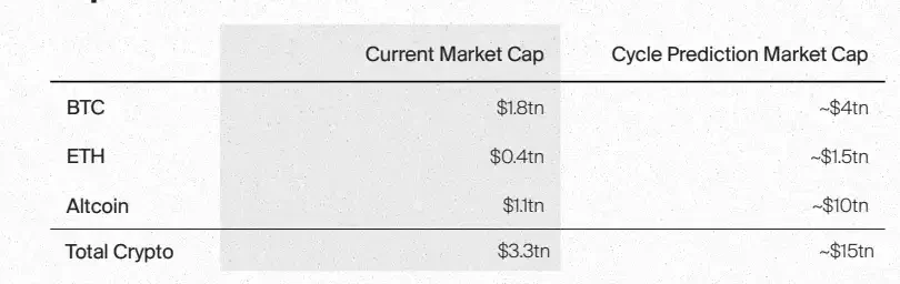 以比特币和以太坊的市值目标作为基准,可以清晰看出 Altcoin 的潜在表现规模。假设本周期总加密市场市值达到约 15 万亿美元,比特币预计市值为 4 万亿美元,以太坊预计为 1 至 1.5 万亿美元,这将为 Altcoin 留下约 10 万亿美元的分配空间。而目前 TOTA L3(即剔除比特币和以太坊的 Altcoin 总市值)仅为 1 万亿美元,这意味着随着周期的成熟,Altcoin 市场总体可能拥有高达 10 倍的增长潜力。