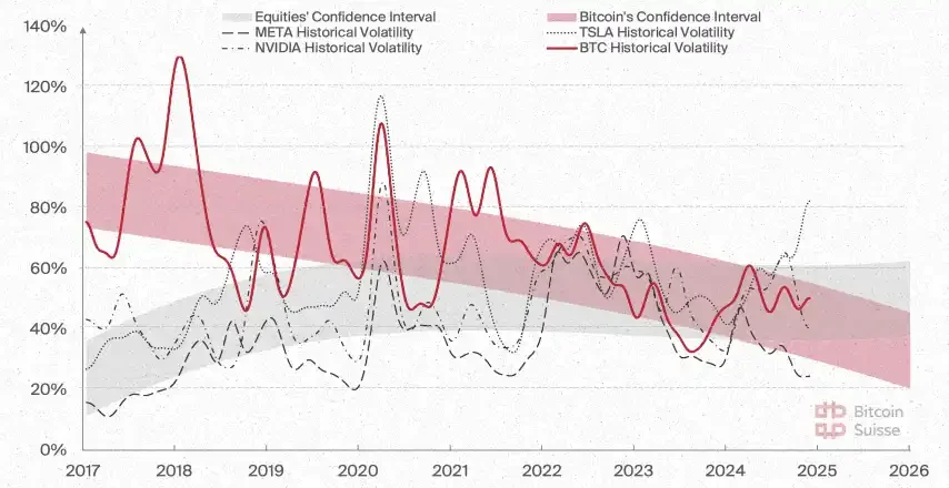4. 比特币的波动性将降至主要科技股以下,标志着机构级资产的成熟