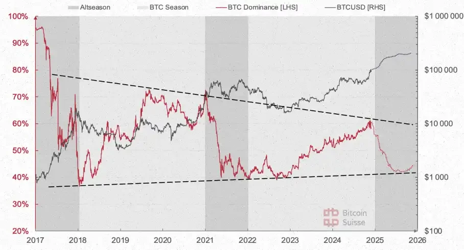 BTC 主导地位的预期下降符合历史趋势以及更广泛的宏观经济动态,包括流动性周期、减半进程,以及减半后和选举后的市场情绪通常放缓的特点。随着流动性改善,高风险资产的投资吸引力增强,资本转向 Altcoin 的趋势将放大其超额回报。这种结构性转变突出了 Altcoin 在周期后期的角色,其相对回报预计将超过比特币。