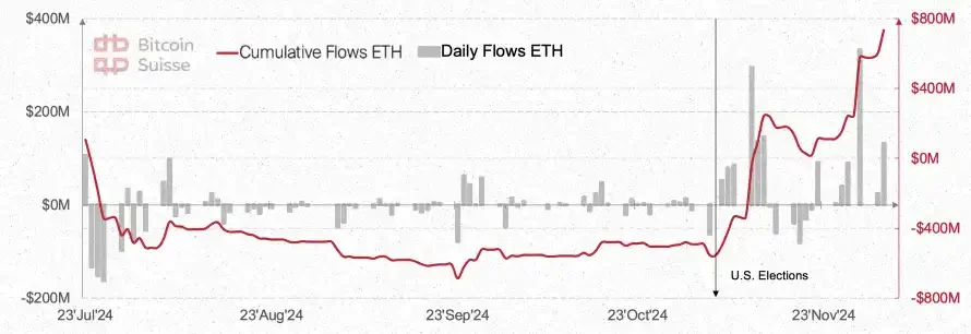 尽管比特币 ETF 以 320 亿美元的净流入和 IBIT 在短短 225 个交易日内接近 500 亿美元的 AUM(管理资产规模)创下纪录,但我们预计,选举后环境将促使资金流向 ETH ETF 发生结构性转变。尽管自 ETF 推出以来表现相对不佳,但基础面显示,在机构参与激增的背景下,ETH 正呈现出日益吸引的风险回报特性。11 月成为 ETH ETF 资本流入的转折点,自 7 月推出以来首次实现净流入,单日流入量甚至达 3.329 亿美元,超越了比特币的 3.2 亿美元。此外,近期资金流入在按市值调整后已赶上比特币。
