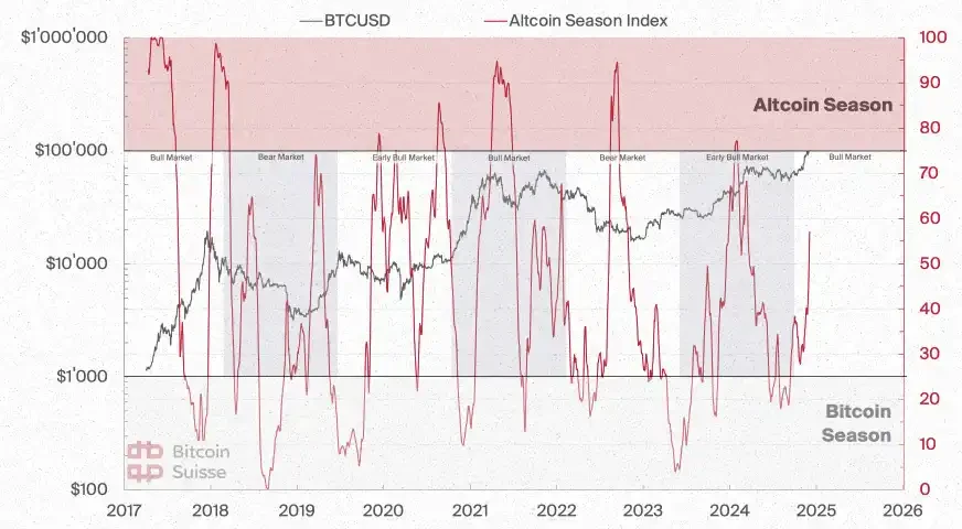 随着加密市场进入 2025 年的关键阶段,Altcoin 赛季即将到来。历史上,这种转换通常发生在比特币主导的熊市后期,此时 Altcoin 的表现持续落后(图表中深灰色区域)。然而,即将到来的市场轮动将推动资本(主要来自比特币)流向 Altcoin,标志着一个决定性且显著的 Altcoin 赛季的开端。